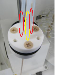 6. Reinstall the reaction tubing into the cap before re-installing the cap onto the analyzer. The yellow line is connected to the bubbler, the others are inserted into the holes in the cap.