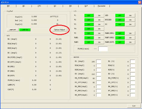 Push the “AUTO” button to make the automatic gain adjustment. If the difference from the constant before the alteration is abnormally large after the automatic adjustment is made, make an adjustment again. If the difference from the original constant is 50 or more, the adjustment will be regarded as no good.